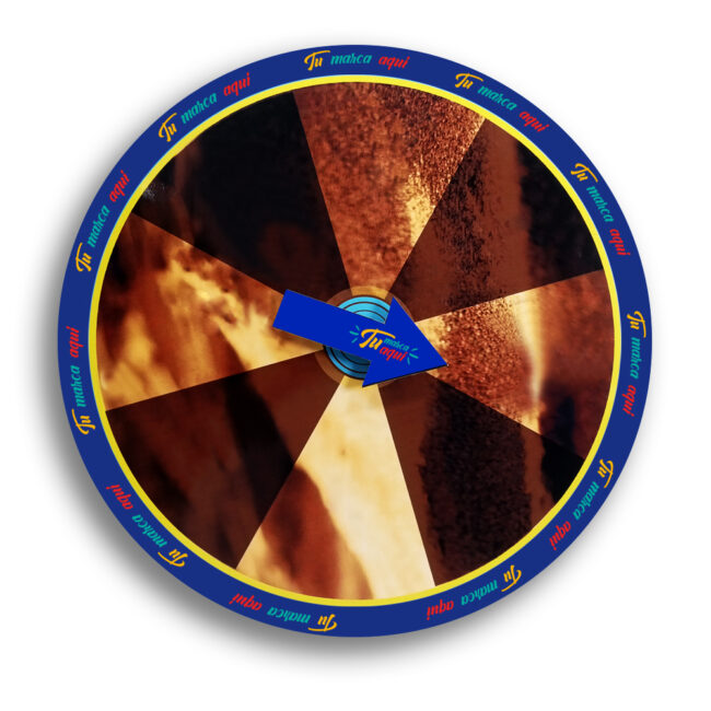 Tamaño 39.5 diámetro, MDF 3mm impresión directa full color, troquelado, con flecha y soporte.